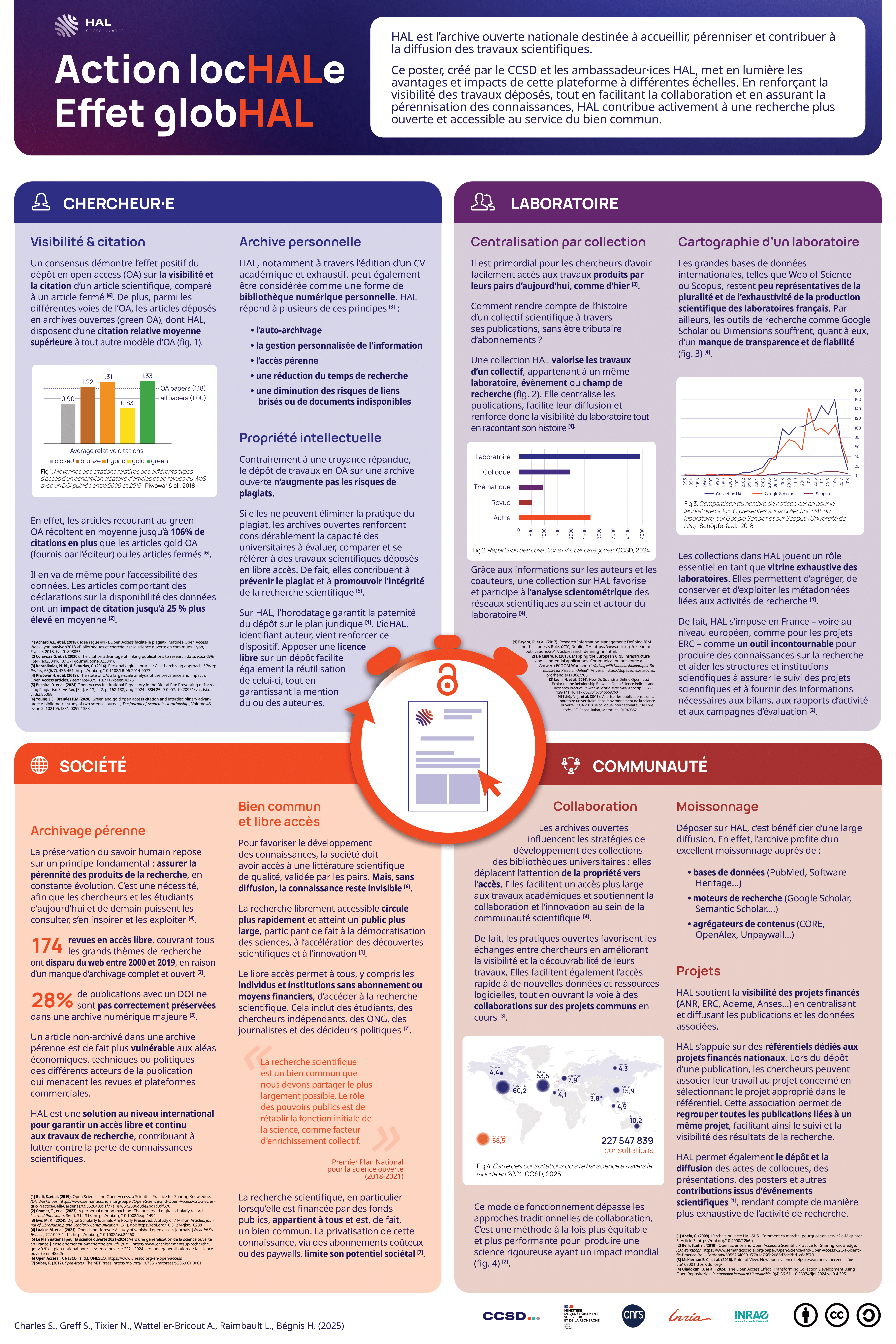 Fruit d’un travail collaboratif mené avec les ambassadeurs et ambassadrices de HAL, deux posters ont été réalisés pour présenter HAL et mettre en avant ses atouts pour la communauté scientifique.