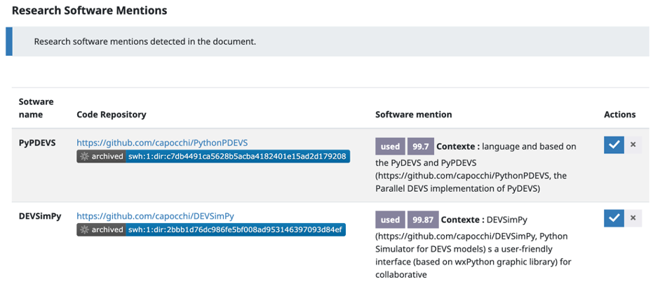 Une fois validée, cela permet ensuite d’enrichir le dépôt avec les liens explicites vers le(s) logiciel(s). Les mentions de logiciel qui ont été validées sont ensuite visibles par tous.